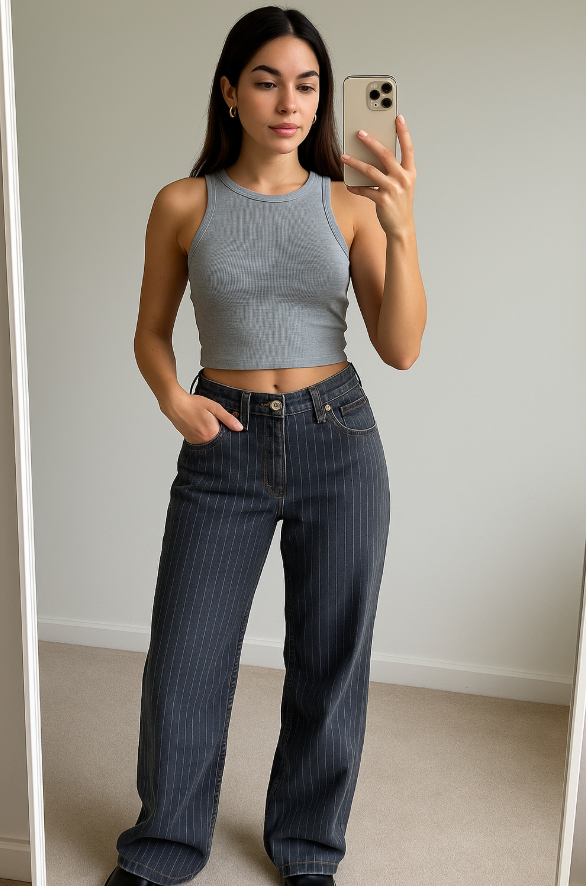 Niet de pantalon van je vader. Deze jeans neemt alles wat we leuk vinden aan krijtstrepen en draait het om—lage taille, wijde pijp, street fit. Combineer met loafers en een baby tee, of met hakken en een blazer voor die “ik doe geen moeite maar win toch”-look.